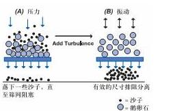 (B)振動(dòng)篩網(wǎng),破壞位于混合物底部的積聚鵝卵石層,使完全分離得以進(jìn)行;切向流過濾中,進(jìn)科流的錯(cuò)流動(dòng)力學(xué)作用,就相當(dāng)于此例中的振動(dòng)。