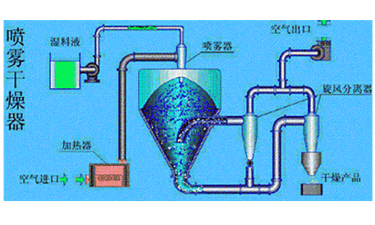 用噴霧干燥器將稀料液(如含水量在75%-85%以上的溶液)噴成霧滴分散于熱氣流中,使水分迅速蒸發(fā)而得到固體產(chǎn)品,干燥時間一般僅需數(shù)秒到數(shù)十秒。噴霧器是噴霧干燥的關(guān)鍵部分,主要離心式,壓力式及氣流式噴霧器。