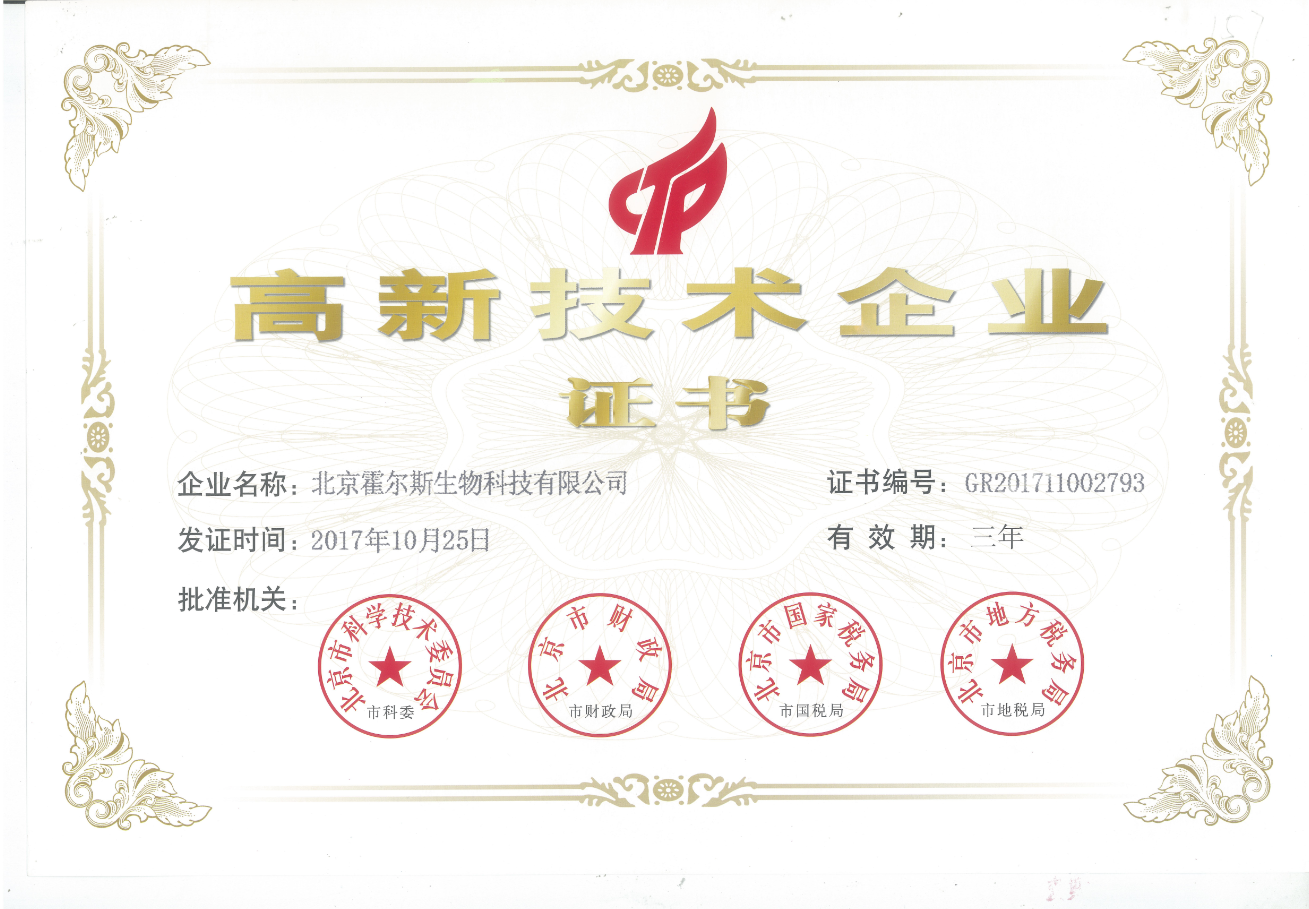 霍爾斯在總經(jīng)理王曲的領(lǐng)導(dǎo)下,2017年獲得了北京市科委頒發(fā)的高新技術(shù)企業(yè)稱號(hào)。