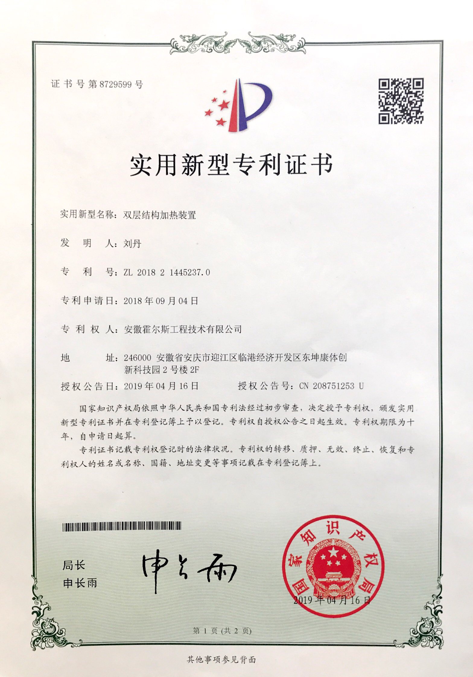 霍爾斯中試型噴霧干燥機(jī)雙層結(jié)構(gòu)加熱裝置榮獲國(guó)家專利證書