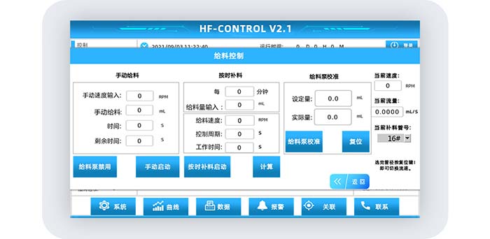 設置手動補料時補料泵的轉(zhuǎn)速,加入的料液體積,啟動后系統(tǒng)可計算出定速定量后補料泵所需工作的時間,以及顯示補料泵剩余的工作時間。
