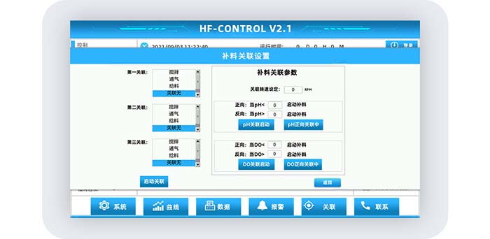 在發(fā)酵過程中,輸入所需的關聯(lián)轉(zhuǎn)速,以及補料正向關聯(lián)DO或補料反向關聯(lián)DO的條件,系統(tǒng)即可進行補料關聯(lián)DO,進行多重調(diào)節(jié)DO,滿足客戶多樣需求。